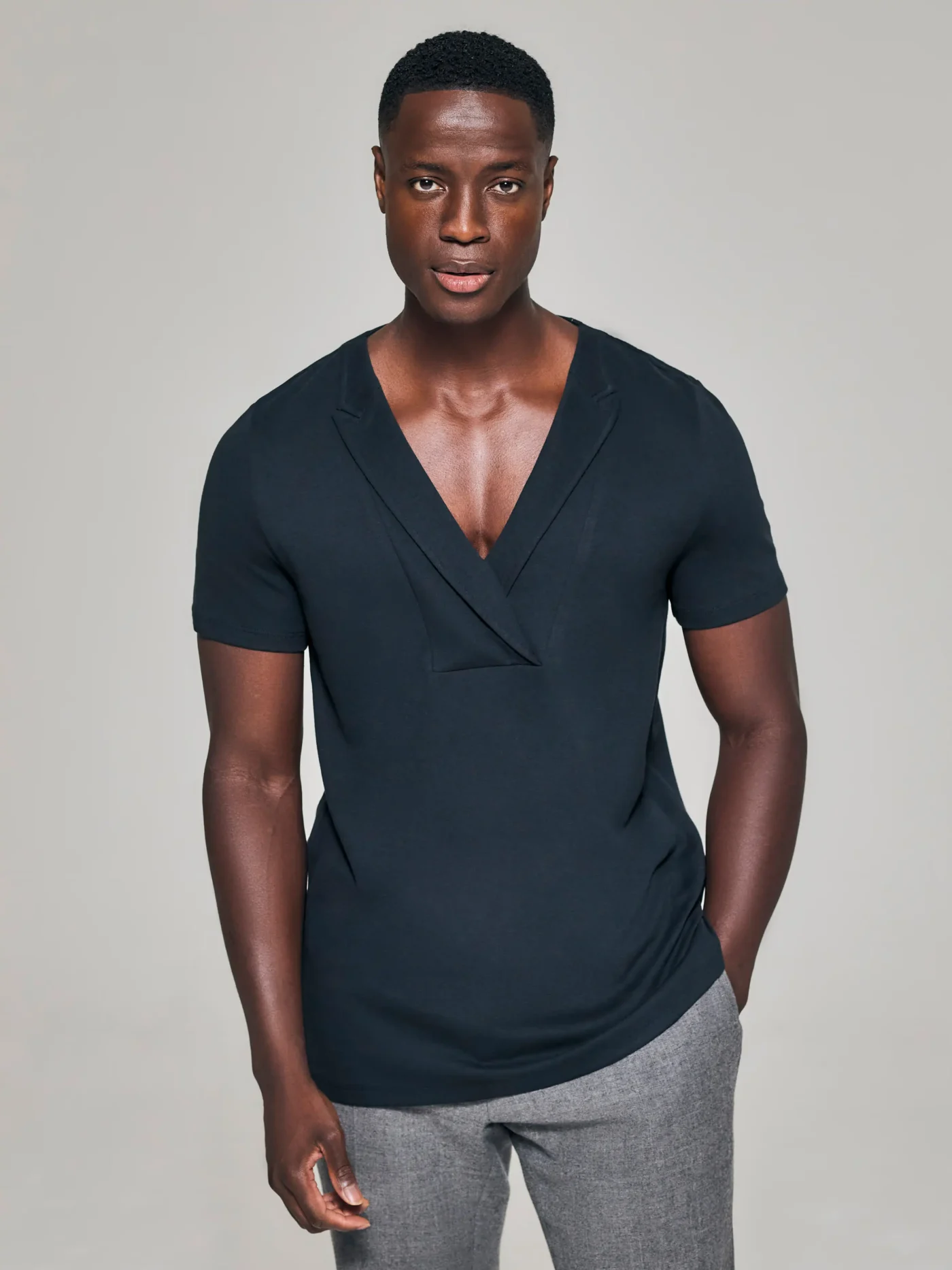 - Bib-fronted design with asymmetric lapels, introducing a contemporary twist on classic tailoring.